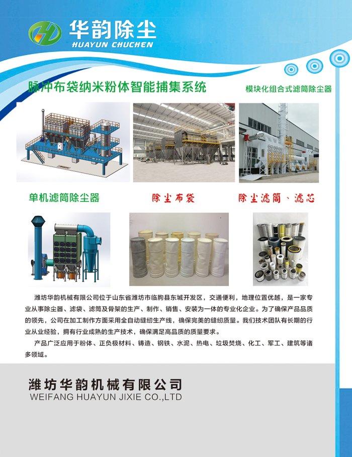 潍坊华韵机械有限公司是一家专业从事除尘布袋、除尘滤筒、除尘滤芯、除尘滤袋及布袋除尘器的生产、销售、安装为一体的专业化企业。为了确保产品的品质.公司在加工制作方面采用全自动缝纫生产线,确保缝纫质量。我们技术团队有长期的行业从业经验,拥有行业成熟的生产技术,确保满足高品质的质量要求。公司生产的多种滤材的工业除尘滤筒,静电喷涂粉末回收滤芯,以及除尘设备和涂装设备中的其他配件。