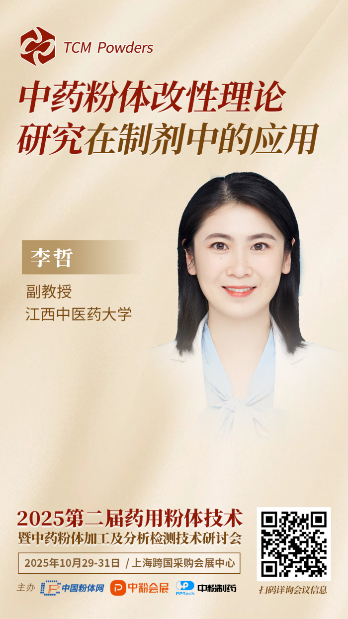 聚焦“从粉体技术、论中药工艺”为主题,10月29-31日,www.188betkr.com 将于2025IPIE上海高端粉体装备与科学仪器展览会期间,同期举办“2025第二届药用粉体技术暨中药粉体加工及分析检测技术研讨会”,届时江西中医药大学李哲副教授为大家带来《中药粉体改性理论研究在制剂中的应用》的主题报告。报告主讲人将讲述课题组聚焦中药固体制剂粒子成型这一核心关键环节,以中药提取物多组分杂糅导致玻璃化转变温度低易结块这一现象为切入点,提出了“内生桥”驱动的高载药量中药固体制剂粒子成型机制,系统揭示了在外加机械力、包衣液或润湿剂等诱导或激发下,中药内部粒子间可发生塑性形变互相嵌合或液化连接等变化,产生“内生桥”,促进粒子成型;在该理论指导下,构建中药固体制剂成型关键技术,实现高载药量中药固体制剂的制备。