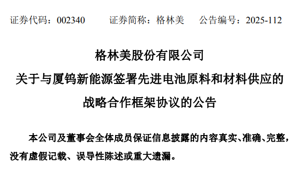 10月25日,格林美发布公告,宣布与厦门厦钨新能源材料股份有限公司于2025年10月24日签署了战略合作框架协议,一致同意发挥各自优势,共同应对全球市场对超高比能电池材料的需求和挑战,打造超高比能电池材料产业联合体。