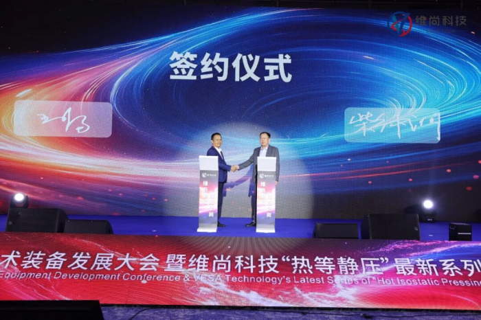 发布会后,湖南维尚科技有限公司董事长柴神洲与滁州欧美克新材料科技有限公司董事长王永富共同签署“热等静压”设备采购协议。