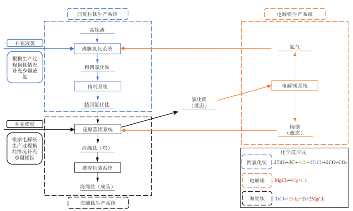 目前金钛股份下设北园区和南园区,北园区有3个生产分厂(氯化分厂、海绵钛分厂和镁电解分厂),3个生产分厂的生产环节相互衔接,采用“氯-镁”循环利用全流程生产模式。而南园区为半流程海绵钛生产线。