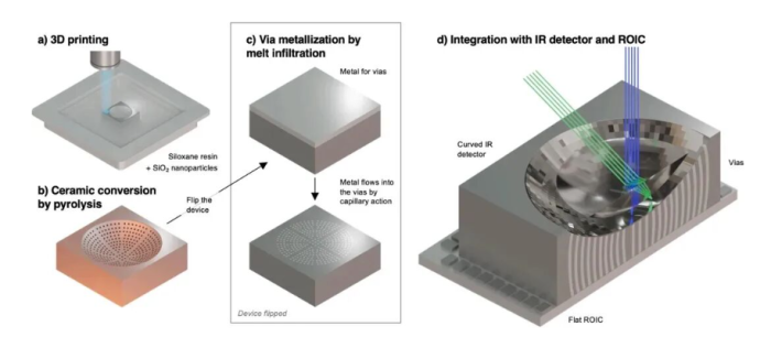 休斯研究实验室(由波音与通用汽车联合创立的前沿技术研发机构)采用摩方microArch? S230高精度3D打印系统,成功制备出具有微米级通孔阵列的陶瓷中介层。该技术实现了通孔直径9μm、间距18μm的突破性指标,并通过创新的熔融渗透金属化工艺,构建了高密度互连的电气通路。这项技术不仅攻克了传统高温共烧陶瓷的结构限制,重新定义了微电子系统的集成模式,还显著缩小了实心孔尺寸,通过3D打印技术重构了微电子封装的底层逻辑,为陶瓷封装领域开辟了全新的技术路径。