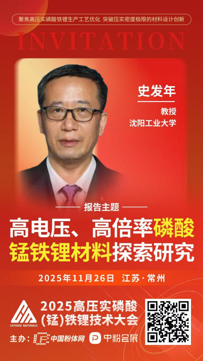 2025年11月26日,www.188betkr.com将在江苏常州举办“2025高压实磷酸(锰)铁锂技术大会”。届时,来自沈阳工业大学的史发年教授将作《高电压、高倍率磷酸锰铁锂材料探索研究》的报告。