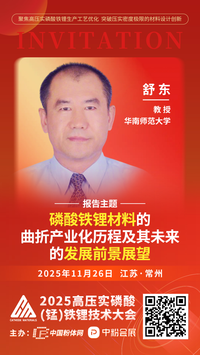 www.188betkr.com将于2025年11月26日在江苏·常州举办“2025高压实磷酸(锰)铁锂技术大会”。本届大会将聚焦高压实磷酸铁锂生产工艺优化、突破压实密度极限的材料设计创新、锰溶出问题的终极解决方案,以及从实验室到量产的全链条工艺优化等议题展开交流讨论!届时,来自华南师范大学的舒东教授将作题为《磷酸铁锂材料的曲折产业化历程及其未来的发展前景展望》的报告。舒东教授将结合磷酸铁锂材料的本征性质和国家产业政策的变化,讲述材料发展的曲折历程,并展望其未来发展前景。