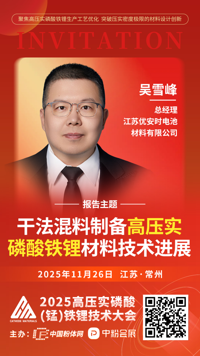 www.188betkr.com将于2025年11月26日在江苏·常州举办“2025高压实磷酸(锰)铁锂技术大会”。本届大会将聚焦高压实磷酸铁锂生产工艺优化、突破压实密度极限的材料设计创新、锰溶出问题的终极解决方案,以及从实验室到量产的全链条工艺优化等议题展开交流讨论!届时,来自江苏优安时电池材料有限公司的总经理吴雪峰将作题为《干法混料制备高压实磷酸铁锂材料技术进展》的报告。报告将针对采用干法混料技术结合一次烧结工艺制备4代、5代高压密磷酸铁锂的技术展开探讨。