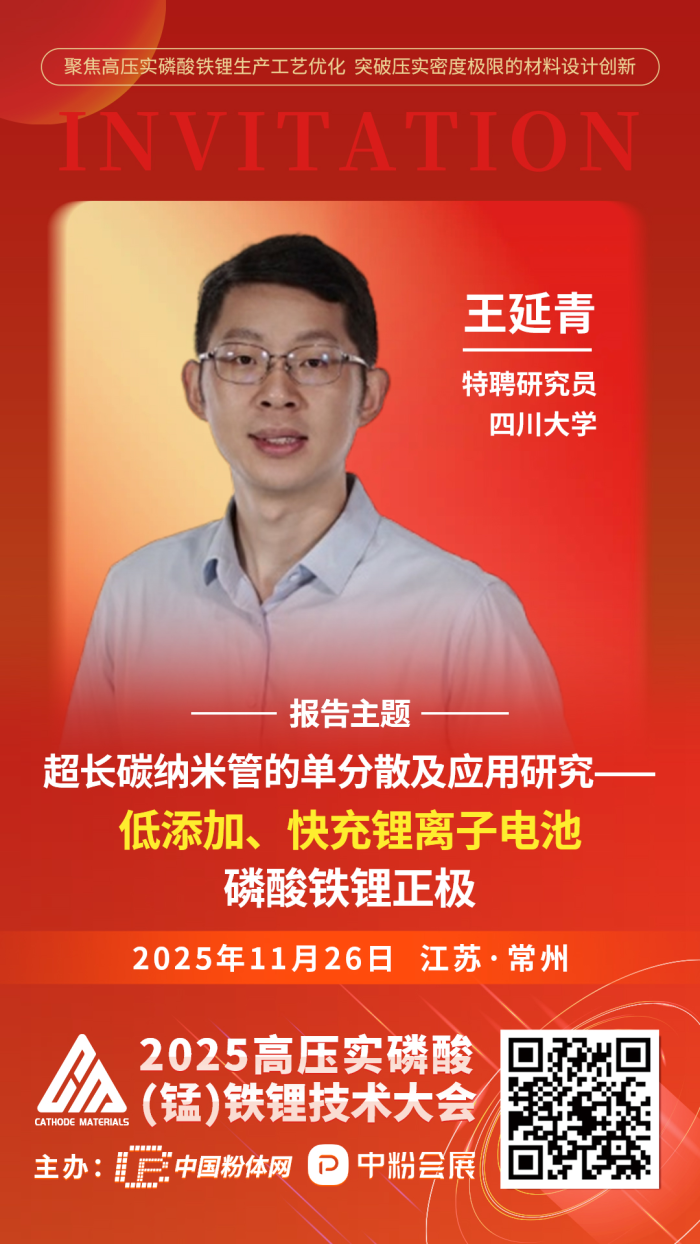 www.188betkr.com将于2025年11月26日在江苏·常州举办“2025高压实磷酸(锰)铁锂技术大会”。本届大会将聚焦高压实磷酸铁锂生产工艺优化、突破压实密度极限的材料设计创新、锰溶出问题的终极解决方案,以及从实验室到量产的全链条工艺优化等议题展开交流讨论!届时,来自四川大学的特聘研究员王延青将作题为《超长碳纳米管的单分散及应用研究——低添加、快充锂离子电池磷酸铁锂正极》的报告。