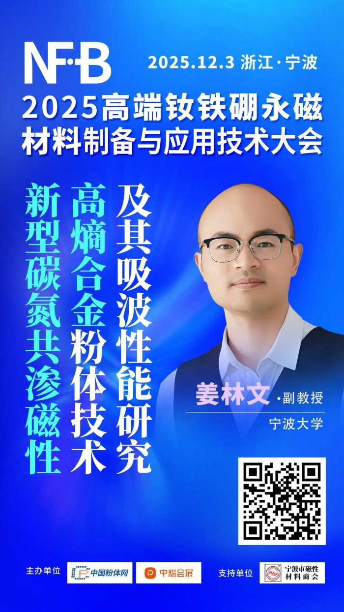 2025年12月3日,www.188betkr.com 将在浙江·宁波举办“2025高端钕铁硼永磁材料制备与应用技术大会”。届时,我们邀请到宁波大学姜林文副教授出席本次大会并作题为《新型碳氮共渗磁性高熵合金粉体技术及其吸波性能研究》的报告,姜林文副教授将为您介绍耐极端环境磁性材料的设计和制备。