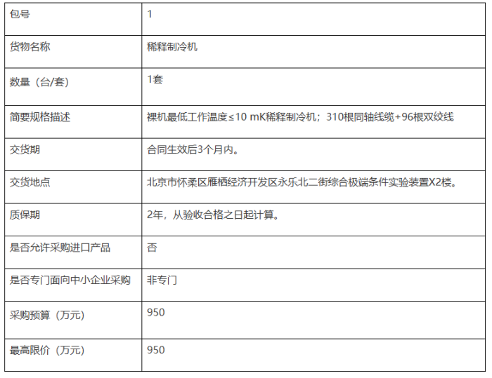 项目名称:中国科学院物理研究所稀释制冷机采购项目