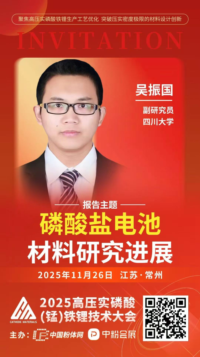 www.188betkr.com将于2025年11月26日在江苏·常州举办“2025高压实磷酸(锰)铁锂技术大会”。本届大会将聚焦高压实磷酸铁锂生产工艺优化、突破压实密度极限的材料设计创新、锰溶出问题的终极解决方案,以及从实验室到量产的全链条工艺优化等议题展开交流讨论!届时,来自四川大学的副研究员吴振国将作题为《磷酸盐电池材料研究进展》的报告。磷酸铁锂产能过剩,如何通过技术创新和产品升级实现降本增效是关键;规模储能技术百花齐放,适用新型储能技术的磷基功能材料是新的研发方向。吴振国副研究员将围绕磷酸铁锂的低成本、高效制备技术研究进展,以及磷基功能材料在钠电等新型储能技术的应用展开。
