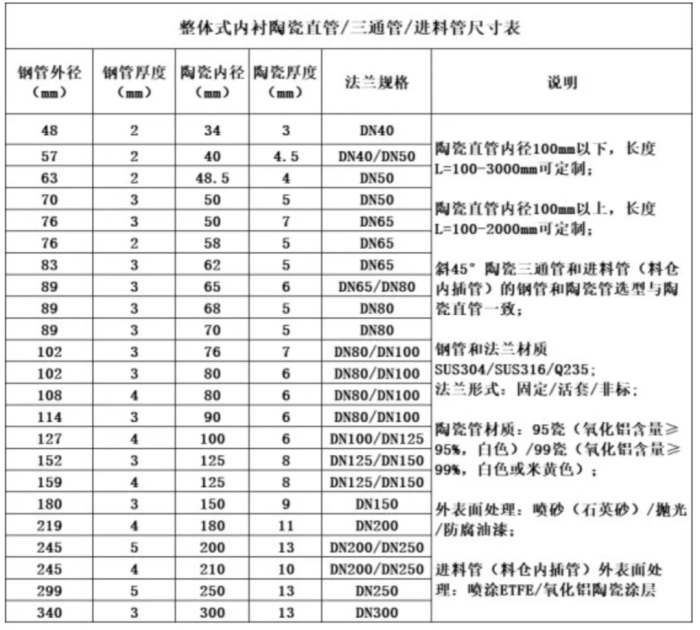 整体式耐磨陶瓷产品(不锈钢内衬陶瓷):整体式内衬陶瓷直管、陶瓷弯管(角度可定制)、陶瓷三通管、陶瓷补气管、陶瓷进料管、陶瓷变径管、陶瓷负压加速室、陶瓷牛角弯、陶瓷玻璃视镜、陶瓷硫化软管(长度可定制)、新型耐磨陶瓷涂层等,目前在新能源电池行业、化工行业、钢铁行业的气力输送系统中应用较多,可配套各种产能要求。