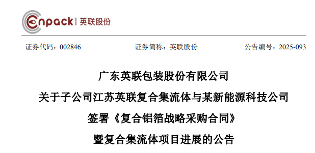 www.188betkr.com 讯11月17日,广东英联包装股份有限公司(简称:英联股份)发布公告称,近日,子公司江苏英联复合集流体有限公司(简称:江苏英联)与某新能源科技有限公司签署了准固态半固态电池用的《复合铝箔战略采购合同》。