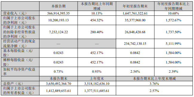 据英联股份发布2025年第三季度报告显示,公司第三季度营业收入5.66亿元,同比增长10.13%;实现归属于上市公司股东的净利润约1020万元,同比增长454.32%。前三季度,公司共实现营业收入约16.48亿元,同比增长10.68%;实现归属于上市公司股东的净利润约3537.8万元,同比增长1572.67%。