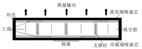 均热板主要由外壳、工质、吸液芯和支撑柱组成。外壳的主要功能是密封内部结构,为相变传热提供稳定且密闭的环境。工质通过其相变潜热,在均热板内部循环流动,带走大量热量,达到散热目的。吸液芯不仅提供流动通道,还促进工质循环,确保高效传热。支撑柱则支撑整个均热板结构,并为工质回流提供通道。
