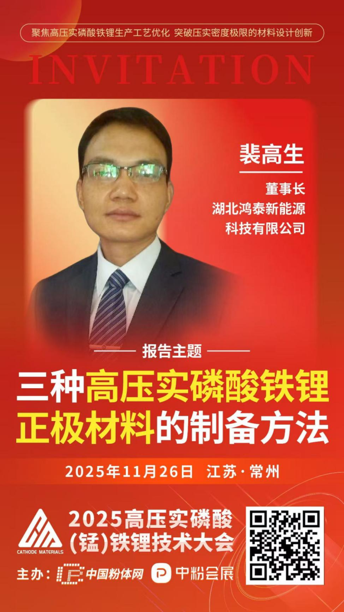 为促进磷酸铁锂产业交流与技术合作,2025年11月26日,www.188betkr.com将在江苏常州举办“2025高压实磷酸(锰)铁锂技术大会”。届时,来自湖北鸿泰新能源科技有限公司的裴高生董事长将作《三种高压实磷酸铁锂正极材料的制备方法》的报告。
