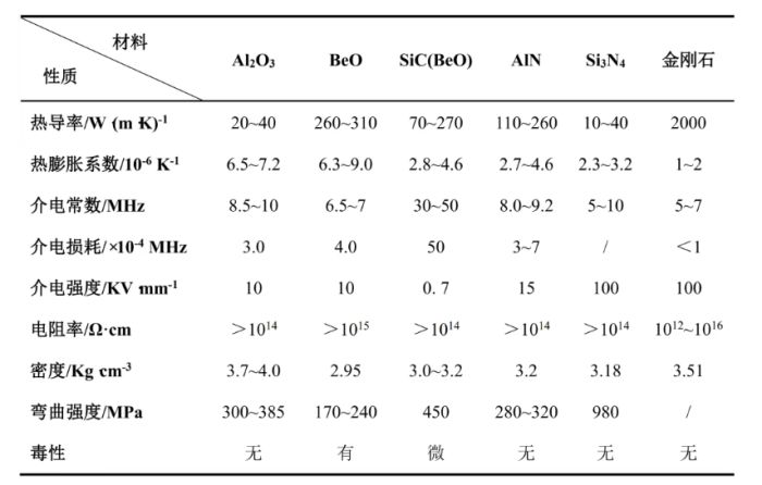 常用的电子封装基板材料主要有三大类:塑料、金属及金属基复合材料和陶瓷。塑封、金属封装基片材料均有相应的缺陷;而陶瓷基板优势明显。目前已经投入生产应用的陶瓷基片主要包括氧化铍(BeO)、氧化铝(Al2O3)和氮化铝(AlN)、氮化硅(Si3N4)等等。