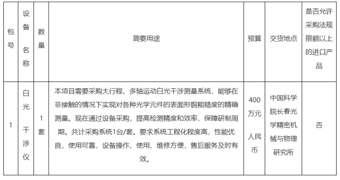 项目名称:中国科学院长春光学精密机械与物理研究所白光干涉仪采购项目