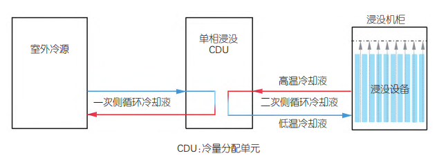两相浸没式液冷技术是利用冷却介质的沸腾相变潜热带走热量,当达到冷却介质的沸点时,在服务器表面发生沸腾相变带走热量,沸腾产生的蒸汽到达冷凝端完成冷凝,经过循环管路回到蒸发端。常用的冷却介质为低沸点、高潜热的氟化液。两相浸没液冷兼具高节能、高散热的技术优势,可同时满足高功率芯片的散热需求。