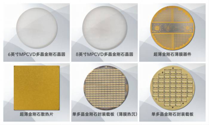 黄河旋风是国内超硬材料领域的龙头企业之一,历史悠久的行业先驱。拥有从人造金刚石、立方氮化硼到各类金刚石制品(如锯切、磨削工具)的完整产业链。在培育钻石领域也是重要的参与者。2025年初,黄河旋风成功生长出半导体用5-30μm超薄6-8英寸多晶金刚石晶圆热沉材料,厚度0.02-1mm,均匀性好,热导率1000-2200W/(m?K)。2025年5月,黄河旋风与博志金钻合资成立河南乾元芯钻半导体科技有限公司,研发金刚石散热材料及器件,推动大尺寸金刚石制备和高端封装。接下来,黄河旋风将重点突破12英寸多晶金刚石晶圆热沉材料制备技术。