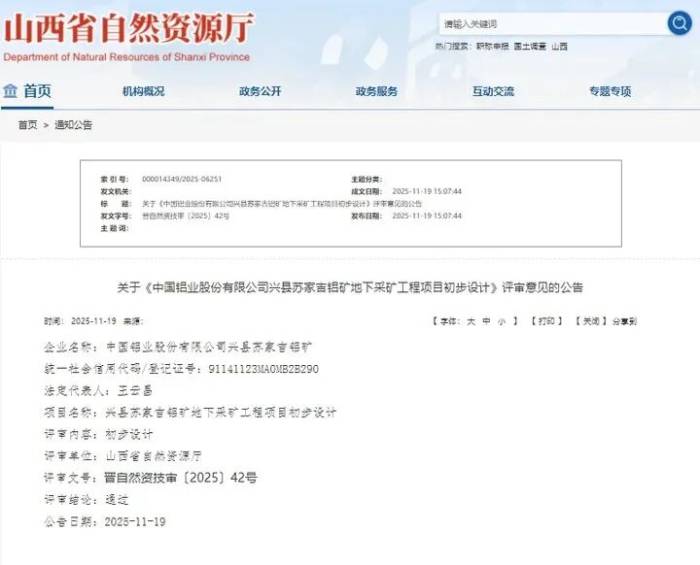 www.188betkr.com 讯11月19日,山西省自然资源厅发布公告,正式批准中国铝业兴县苏家吉铝矿地下采矿工程项目的初步设计。铝矿项目是中国铝业在山西省吕梁市兴县布局的重要棋子,也是其控股子公司山西华兴铝业有限公司氧化铝生产线的核心配套项目。