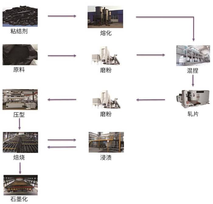 国内企业多采用多次浸渍和焙烧工艺,流程长、耗能耗时,国外公司多采用预处理技术、改性技术等自主研发的专用浸渍剂沥青,喹啉不溶物含量低于1%,最多浸渍一次。另外,国内部分企业在开发不经过浸渍直接焙烧的一焙品直接石墨化技术,这是特种石墨生产工艺的一个巨大进步。