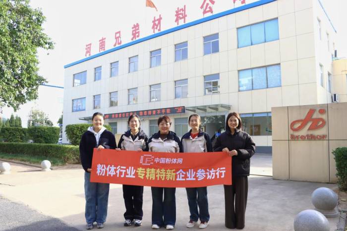 粉体网一行与济源兄弟营销部成员合影留念(中:营销部部长张祯祯;左二:营销部经理王丹丹;右二:营销部经理焦婷婷)
