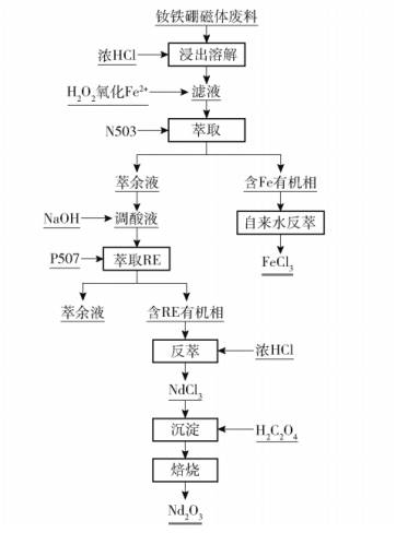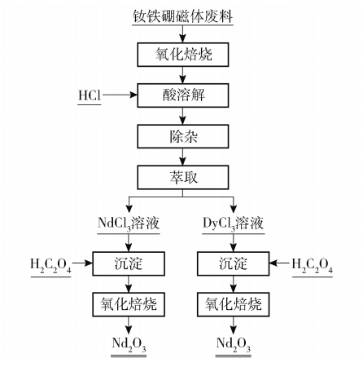 Wang等[9]采用盐酸优溶法回收钕铁硼磁铁废料中的稀土元素,首先通过氧化焙烧将稀土转化为氧化物,分次加入盐酸盐调整pH值使稀土氧化物转化为稀土氯化物优先溶解进入溶液,而氧化铁则成为熔渣,从而将稀土氧化物与氧化铁分离。将含稀土氯化物的溶液通过萃取分离制得单一的稀土氯化物,最后加入沉淀剂草酸,得到稀土草酸盐沉淀,在1273K下对沉淀物进行焙烧得到钕氧化物,稀土回收率可达99%。