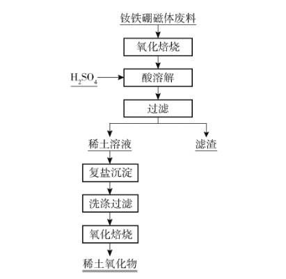 肖荣辉[10]于2001年提出从钕铁硼磁体废料中提取稀土元素的复盐沉淀法,其流程如图5所示。整个工艺通过使用硫酸来溶解氧化焙烧后的钕铁硼废料,然后在较高温度下加入硫酸钠与稀土元素反应,形成稀土复盐沉淀,然后再加碱转化,草酸沉淀稀土,最后灼烧得到稀土氧化物。