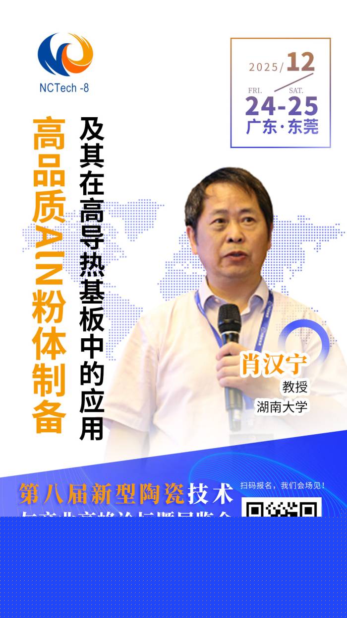 在此背景下,2025年12月24-25日,www.188betkr.com将在广东东莞举办“第八届新型陶瓷技术与产业高峰论坛”,届时,湖南大学肖汉宁教授将带来《高品质AlN粉体制备及其在高导热基板中的应用》的报告。
