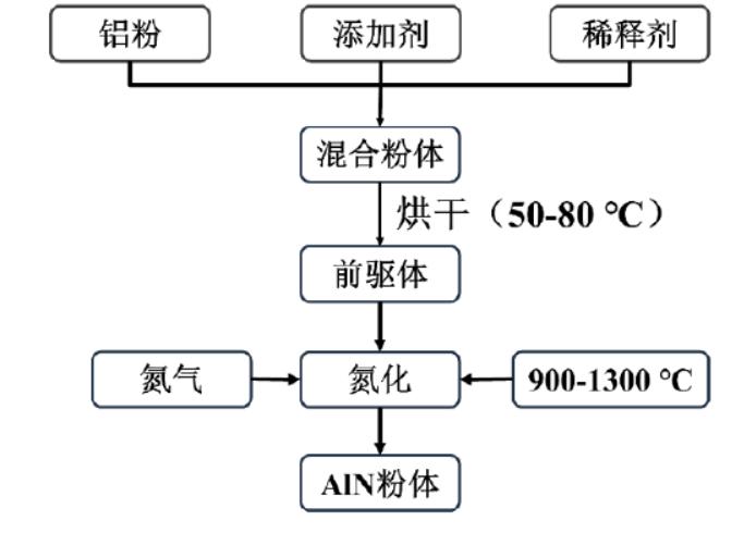 直接氮化法由于其成本低、周期短、产量大及适用于大规模生产等优势,已成为工业中一种较为常见的AlN粉体制备方法。该方法通常在持续流动的氮气(N2)和氨气(NH3)气下,于高于900℃的温度下促使Al与气氛反应,从而生产AlN粉体。