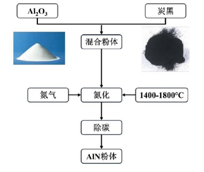 碳热还原法(CRN)是当前制备AIN粉体的重要工艺之一。该方法以 Al2O3粉体和高纯炭黑(C)作为前驱体,充分混合后置于流动的N2气氛中,并在1400℃-1800℃的高温条件下进行反应。