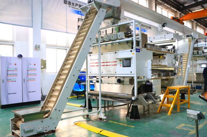随后,众人前往设备车间,陈经理现场演示了干湿颗粒通用矿石分选机的运行效果。该设备搭载深度学习技术,针对1-3公分的碳酸钙矿石原料,能高效剔除浅灰色、浅黄色等次品,每小时处理量达16-20吨,完全满足碳酸钙客户的分选需求。据了解,该设备适用范围广泛,可实现2-50毫米干料、10-50毫米湿料的精准分选,在非金属矿、黑色矿石、有色矿石及贵金属等矿物分选场景中表现突出。