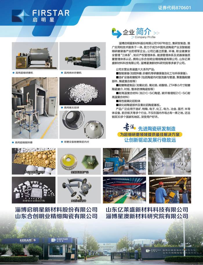淄博启明星新材料股份有限公司创建于1997年,注册资本5636万元,员工400余人,是国家高新技术企业、国家专精特新小巨人企业、山东省瞪羚企业。下设子公司山东合创明业精细陶瓷有限公司、山东亿莱盛新材料科技有限公司、淄博星澳新材料研究院。2017年新三板挂牌,证券代码:870601。公司致力成为中国先进陶瓷产业、智能超细研磨装备产业的领军企业。已通过质量、环境、职业健康安全管理“三体系”、能源管理体系及武器装备质量管理体系认证。
