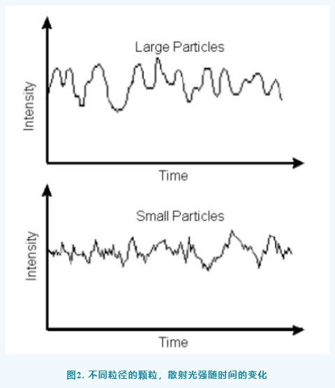 分散在溶液相的纳米颗粒由于受到溶剂分子的撞击,呈现出无规则的运动,我们称之为布朗运动'/span>Brownian motion),如果我们将一束激光照射至含有该纳米颗粒的溶液中,溶液相中的颗粒会产生散射光,随后在一定的角度收集相关的散射光,我们就能得到如国/span>2所示的散射光强随时间的变化曲线,可以看出大颗粒布朗运动较为缓慢,散射光强的变化频率较慢(图2,上)。小颗粒则相反,由于其布朗运动剧烈,接收到的散射光强的变化频率较快(国/span>2,下)、/span>