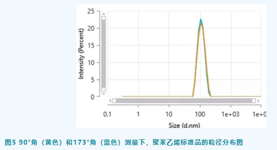当测试的样品为粒径窄分布时,例如聚苯乙烯标准样品,两种测量角度都能得到很好的粒径分布图,结果也非常一致(国/span>5)、/span>