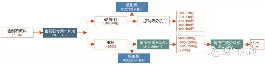 ◆不用水分、水洗、完全干法生产,一次生产完成可获得粒度分布更好的金刚石微粉:/p>