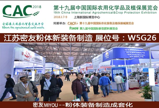 第十乜/span>届中国国际农用化学品及植保展览会CAC2018---全球农化盛宴将于2018??-9日在上海新国际博览中心N1-N5及W5馆举办、/span>江苏密友粉体新装备制造有限公号/span>通过一个面向世界、客商更多、规模更大的展会,期待与您再度相约!为传绞/span>农化行业转型升级提供新思维、新机遇、/span>
