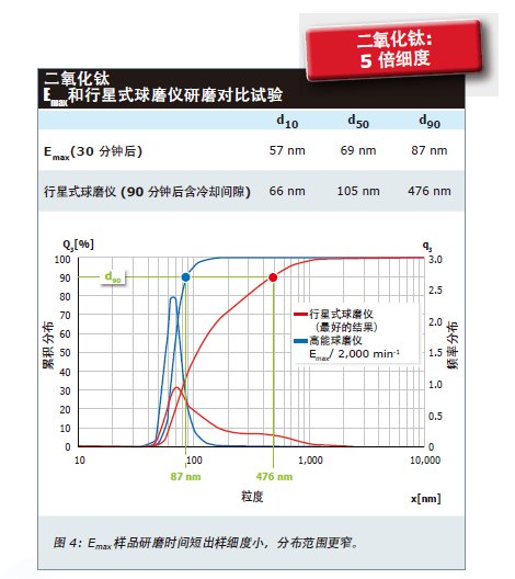 以颜料为例,在颜料的使用过程?/span>,要求其具有微细的粒度和均匀的粒度分市/span>,这就必须对颜料进行研磨分散。使用德囼/span>Retsch(莱驰)行星式球磨仪咋/span>Emax两种研磨仪器,对二氧化钛颜料粉末进行研磨比对'/span>50 ml氧化锆研磨罐+/span>110g 0.1 mm直径研磨球,10g样品+/span>15 ml 1%六偏磷酸钠)、/span>Emax仅仅用了30分钟样品D90就达到了87 nm,而行星式球磨仪一共用亅/span>90分钟(其中净研磨时间?/span>30分钟)包括冷却时间,并且最终出样细?/span>D90也只月/span>235 nm.对比结果Emax只用了行星式球磨仪三分之一的时间却完成了其2.7倍细度、/span>
