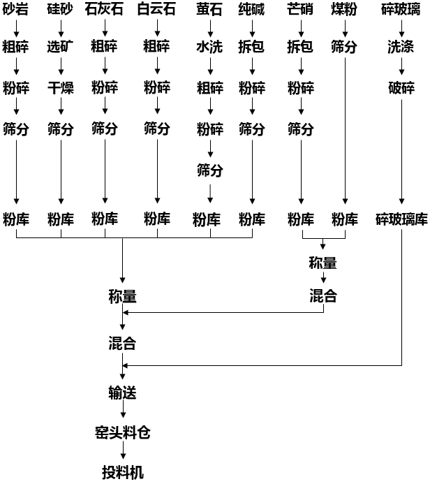 防弹玻璃的制备中需要用到多种粉体材料以满足其具有高透明度和高强度等性能。通常将砂岩、硅砂、石灰石、白云石等材料粉碎成一定目数的粉体来制造防弹玻璃。其配料工艺如下9/p>