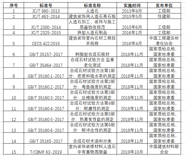 近年来,随着我国人造石英石行业逐步由新兴走向成熟,国家质检总局、国家标准委、工信部、住建部等部委陆续颁布并实施了一系列相关的国家标准和行业标准、/p>