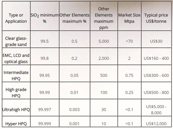 目前,ASQ高等级硅砂用于生产:浮法玻璃、玻璃容器、TFT–LCD玻璃、包括光纤在内的玻璃纤维、特种玻璃等。HPQ?99.95%SiO2)被认为是一种具有低吨位、高价值市场的高度专业化商品。主要用于半导体、太阳能电池板等。据了解,不同级别的HPQ市场定价300美元/吨以上不等,超级HPQ的市场定价甚至高?2000美元/吨、/p>