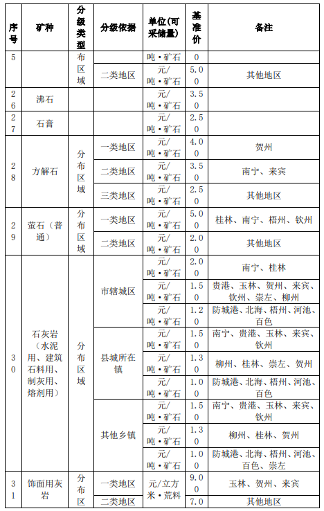 中国粉体网讯为维护矿产资源国家所有者权益,促进矿业经济健康有序发展?022?1?2日,广西壮族自治区自然资源厅根据实际需要补充制定部分矿种矿业权市场基准价,并对探矿权市场基准价?3种矿产采矿权市场基准价开展评估及调整工作。通过统计分析、矿山调研、问卷调查、模拟测算、编制报告等工作,形成《广西壮族自治区矿业权出让收益市场基准价(征求意见?》、/p>