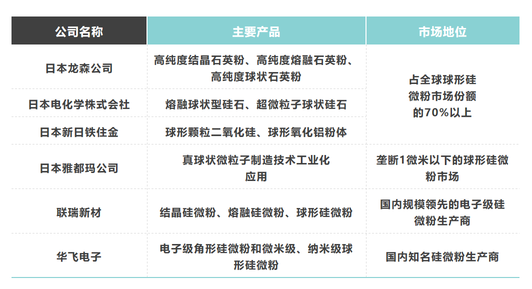 全球高端硅微粉以海外厂商为主,国内龙头企业快速发展。日本公司在硅微粉市场特别是技术壁垒更高的电子级硅微粉市场及应用方面经验丰富,具备先发优势。其中日本龙森公司、日本电化学株式会社、日本新日铁住金三家企业占据全球球形硅微?0%的份额。日本雅都玛公司垄断?微米以下的球形硅微粉填料市场。国内较大的硅微粉企业主要分布在江苏连云港、安徽凤阳和浙江湖州等地,其中连云港东海县在国内最早开始进行电子级硅微粉的生产开发,是国内最大的硅微粉生产基地。国内目前处于领先地位的企业包括联瑞新材、华飞电子等、/p>
