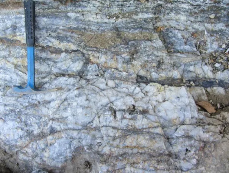 (2)变质热液型:以区域变质或混合岩化作用产生的热液为主。强烈的岩浆活动及构造运动为变质作用提供热源,含水的火成岩和基底原岩受变质作用时,释放出大量的水而形成变质热液,这些含矿溶液受构造应力作用沿韧性剪切带运移,由于温压条件的变化,SiO2过饱和形成沉积,形成脉石英矿。如:安徽太湖县白石山脉石英矿床属变质热液型脉石英矿床,分东西两个矿段,其中东矿段矿体长165m,宽70?3m;西矿段矿体?40m,宽72m,矿石的矿物组成主要为石英,含量多数?8%?9%以上,平?8.76%。该矿床脉石英矿石经浮选后SiO299.92%、Al2O30.0074%、Fe2O30.0017%,达到高纯石英的质量要求、/p>