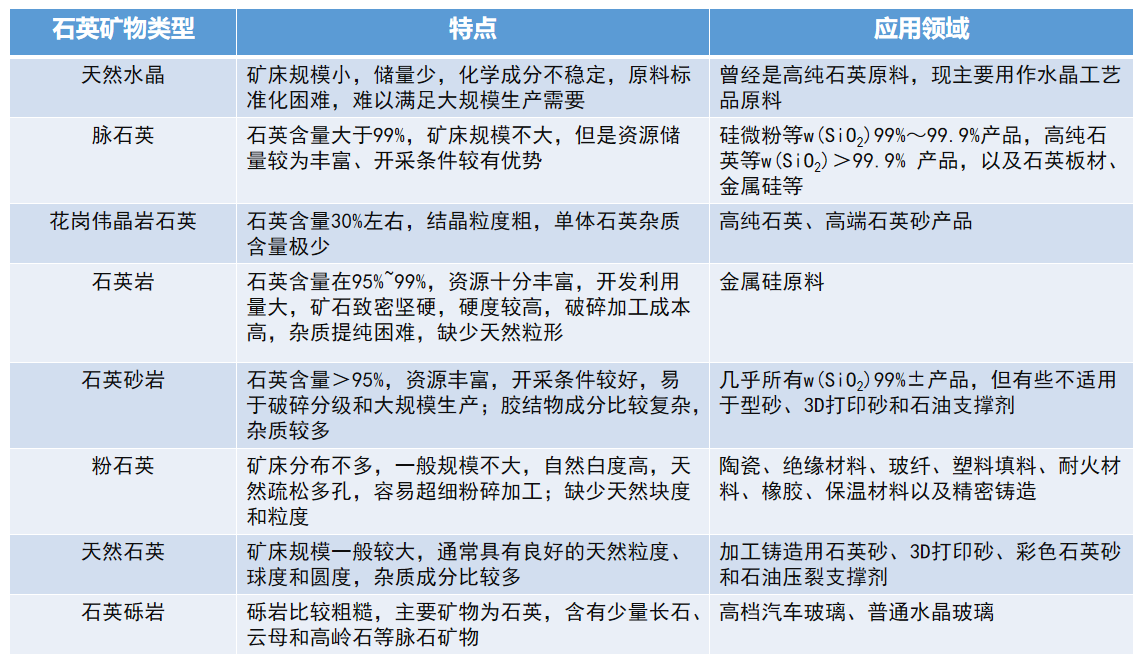 中国粉体网讯石英的物理和化学性质稳定,是一种重要的矿产资源,被广泛应用在冶金、玻璃、陶瓷、铸造、建筑、化工、光学和装饰等传统行业。高纯石英是自然界产出的(如水晶)或由较纯净石英原料加工而成的高品质石英,是某些高新技术产业生产所必需的原料、/p>