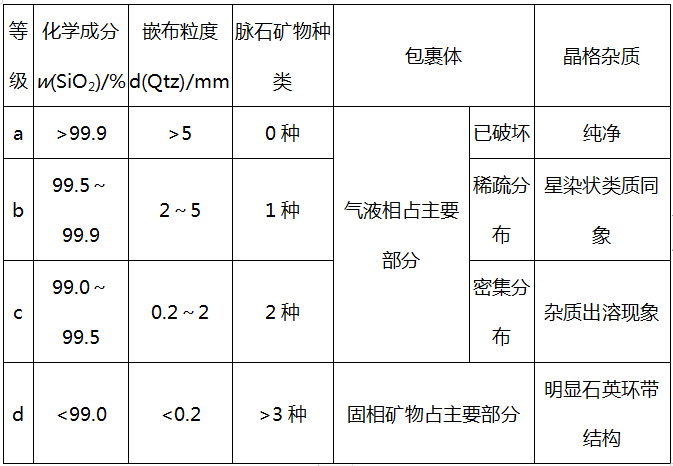 同时,二者的加工工艺也有一定的差别,这一差别是由石英原矿的提纯潜力所决定的,一般是根据其提纯所能达到的极限纯度作为其区分的主要因素,而提纯潜力的判别可以具体依据化学成分、嵌布粒度、脉石矿物、包裹体和晶格杂?个关键评价指标,这些因素之间的关系常常交叉耦合,构成了高纯石英原料的评价因子。依据我们实验室的研究成果,我们认为,当石英原料在以?个关键评价指标中?个及以上指标达到a级时(表1),可以推荐为高纯石英原料。而无法满足高纯石英原料要求,但也具有良好的可选性和稳定性的样品,则可以作为光伏玻璃用石英砂原料进行加工、br/>