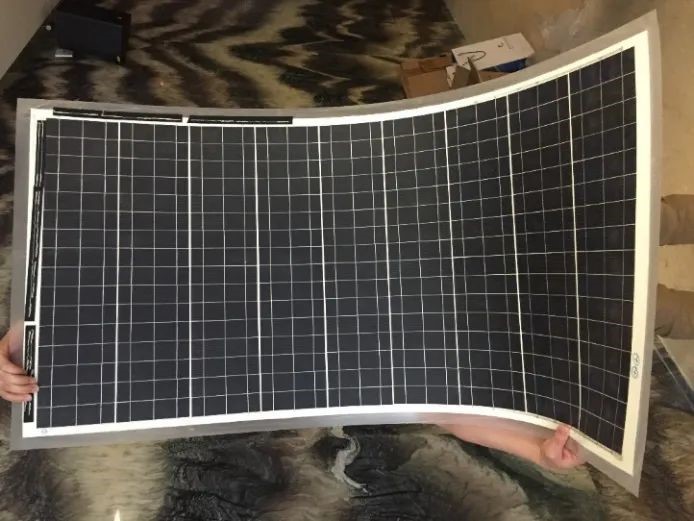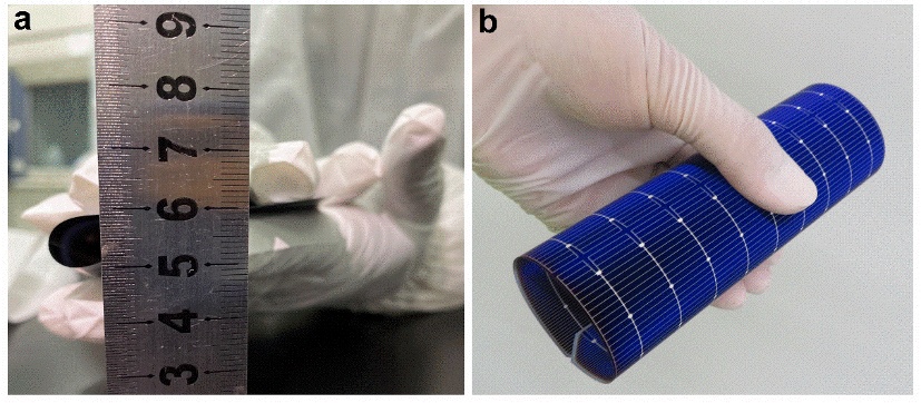 图a:柔性太阳能电池硅片弯曲半径小于5毫米;图b:柔性太阳能电池弯曲角度超过360度、/p>