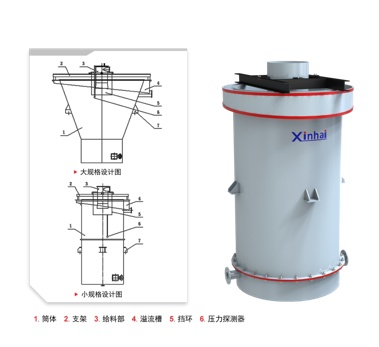 第二种设备是受阻沉降器,其在硅砂行业应用比较广泛,应用到分级和脱泥作业中。鑫海的受阻沉降器采用了几个比较新颖的结构。第一是底下水嘴采用高弹性橡胶和特殊的开口设计,在给入压力水进行干涉沉降的时候,水嘴能够自动打开,停车的时候能够自动锁闭,这样不易堵塞,能够保证生产流程的畅通。另外,此设备采用干涉沉降,干涉沉降比自然沉降的分级效率大大提高。在干涉成降的时候,干涉水流能够使细颗粒从上面流出去,粗颗粒从底下排出来,从而使分级的粗物料、细物料及泥能够最大限度的分开、/p>