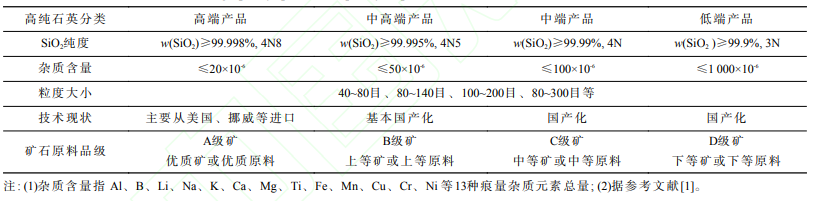 高纯石英产品的第一个特征,即最显著特征是它们的SiO2纯度高。汪灵[1]根根据我国高纯石英产品生产及应用情况,按SiO2纯度将高纯石英产品划分为4个等级,即高端?SiO2)?9.998%?N8),中高端?SiO2)?9.995%?N5),中端ω(SiO2)?9.99%?N),低端ω(SiO2)?9.9%?N);或以产品中Al、B、Li、Na、K、Ca、Mg、Ti、Fe、Mn、Cu、Cr、Ni?3种杂质元素总量进行划分,即高端?0×10?6,中高端?0×10?6,中端≤100×10?6,低端≤1000×10?6、/p>