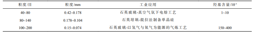 高纯石英产品第二个重要特征是它们的粒度要求,即加工的产品是砂,是具有一定粒度的产品。粒度作为高纯石英一个重要指标,其粒度范围一般是40~150目,具体粒度应根据工业应用确定。如?所示,采用真空气氛下电熔工艺制备石英玻璃,粒度要求40~80目;提拉法制备单晶硅的石英坩埚,粒度要求80~140目;以氢气与氧气为能源的气炼工艺制备石英玻璃,粒度要?00~200目、/p>
