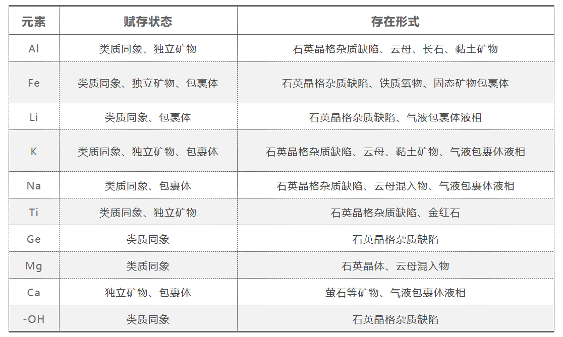 石英在现代科学和技术领域的重要地位和作用越来越凸显,其矿物学的研究对于了解杂质矿物特性和选择分离石英的工艺至关重要。天然石英中杂质元素的赋存状态、石英嵌布特征、包裹体数量大小以及晶格杂质等是选择石英原料合适的杂质分离方案的重要支撑。因此分析石英原料的杂质赋存状态,对于后续选择合适的石英除杂提纯方案是非常有必要的、/p>